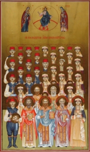 Πέντε Ιερομάρτυρες της Ναούσης που μαρτύρησαν την Πέμπτη της Διακαινησίμου του έτους 1822, σφαγιάσθηκαν υπό των Οθωμανών την ώρα που ιερουργούσαν στον ιερό ναό του Αγίου Γεωργίου Ναούσης που πανηγύριζε εκείνη την ημέρα. Από τους πέντε ιερείς μας είναι γνωστά τα ονόματα μόνο των τριών: Γεράσιμος ο Πνευματικός, Δημήτριος ο Σακελλάριος και Ιωάννης ο εκ Πέτρας Ολύμπου. Μαζί τους μαρτύρησε και πλήθος πιστών οι οποίοι συμμετείχαν στην Αναστάσιμη Θεία Λειτουργία.