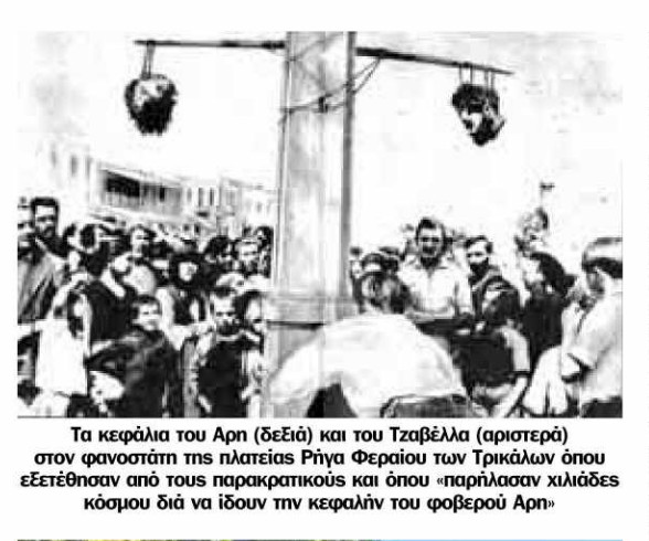 Είναι εκεί. Στην πλατεία Ρήγα Φεραίου των Τρικάλων, οι οπλισμένοι φρουροί κατεβαίνουν από το αυτοκίνητο και σε λίγο καλούν με φωνές τους αλυσοδεμένους Ελασίτες να αντικρίσουν το αποτρόπαιο θέαμα. Στο ίδιο σημείο που εαμική ηγεσία, πριν από λίγους μήνες είχε αναγγείλει στο παγωμένο πλήθος τη συμφωνία της Βάρκιζας κρέμονται από ένα στυλό τα κεφάλια του Άρη και του Τζαβέλα! Την κτηνωδία χρεώνονται απευθείας η κυβέρνηση και κυρίως ο καθ’ ύλην αρμόδιος υπουργός Εσωτερικών Κωνσταντίνος Τσάτσος, οι οποίοι έδωσαν την άδεια γι’ αυτή την αποκρουστική έκθεση κεφαλών».