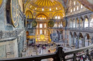 Στο μεταξύ ή Άγια-Σοφιά, έχει γεμίσει με Τούρκους κι ανάμεσα τους υπάρχουν και πολλοί Έλληνες της Πόλης, πού βρέθηκαν εκεί αυτή την ώρα και παρακολουθούν με συγκίνηση τη λειτουργία, χωρίς να τολμούν να εξωτερικεύσουν τα συναισθήματα τους «δια τον φόβον των Ιουδαίων» δηλαδή των Τούρκων. Μόνο κάποιες στιγμές δεν μπορούν να συγκρατήσουν τα δάκρυα, πού τρέχουν από τους οφθαλμούς τους και για να μην προδοθούν φροντίζουν και τα σκουπίζουν πριν γίνουν «πύρινο» ποτάμι και τότε ποιος θα μπορούσε να τα συγκρατήσει.